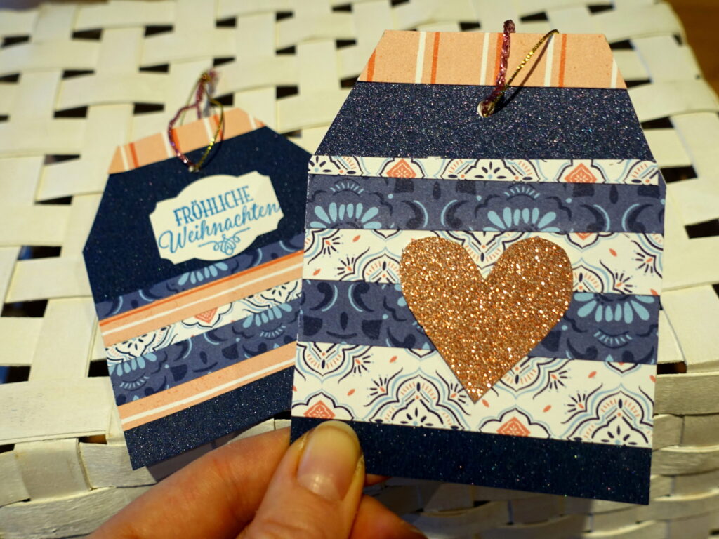 In der Mitte wird ein Blickfang befestigt, hier schnitt ich aus einem Reststück Glitzerpappe ein farblich passendes Herz. Auf der Rückseite fixierte ich ein ausgestanztes Etikett und stempelte „Fröhliche W